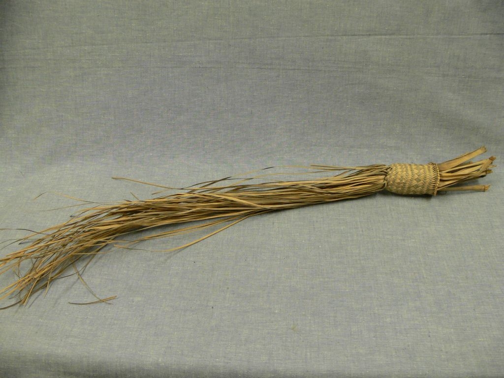 Vékony, keskeny, puha gyékénycsíkokból fonott kis kosárka. Zárt végéről hosszú szálak, nyitott végéről keskeny csíkok lógnak. A kosarat alkotó csíkok világos és sötét színűek, a kettő váltakozásából adódik a díszítő motívum.