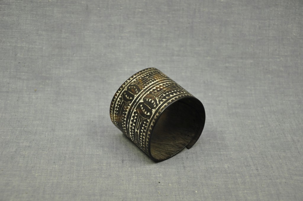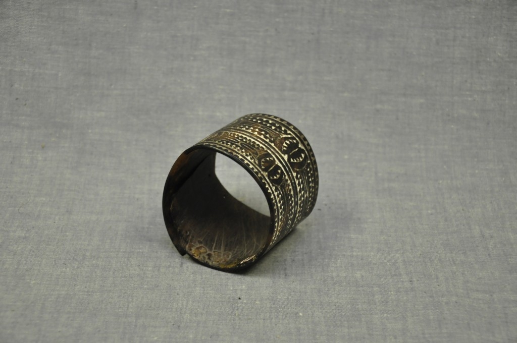 Barnás színű, helyenként áttetsző, henger alakú, teknősbékahéjból készített tárgy. Végei egymásra hajlanak. Külső felületét két sávban elhelyezett fehérrel inkusztrált, geometrikus motívumokból álló díszítések borítják. Egyik végén alul és felül két kis lyuk van.