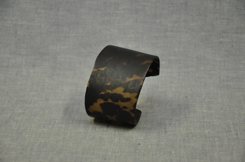 Sötétbarna színű, helyenként áttetsző, henger alakú tárgy. Összeérő végeinél úgy van kiképezve, hogy csak két keskeny nyúlvány ér össze és fekszik egymásra. Teljesen díszítetlen.