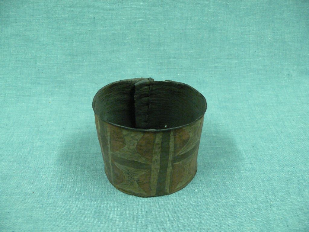Henger alakúra hajlított, belső oldalán barnás színű kéreg, külső oldalán piros és barna színű ívelt mintákkal. A kéregcsík két vége össze van varrva.