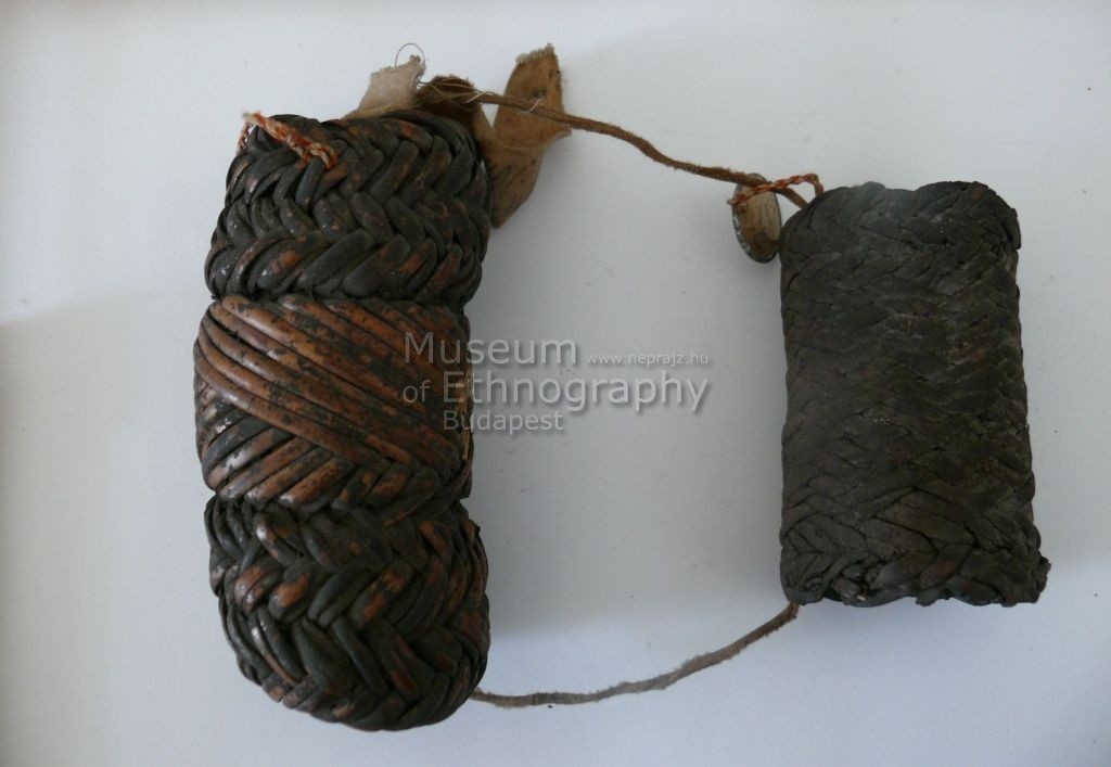 Feketés színű, hengeres, hosszúkás rotang fonat két részben.