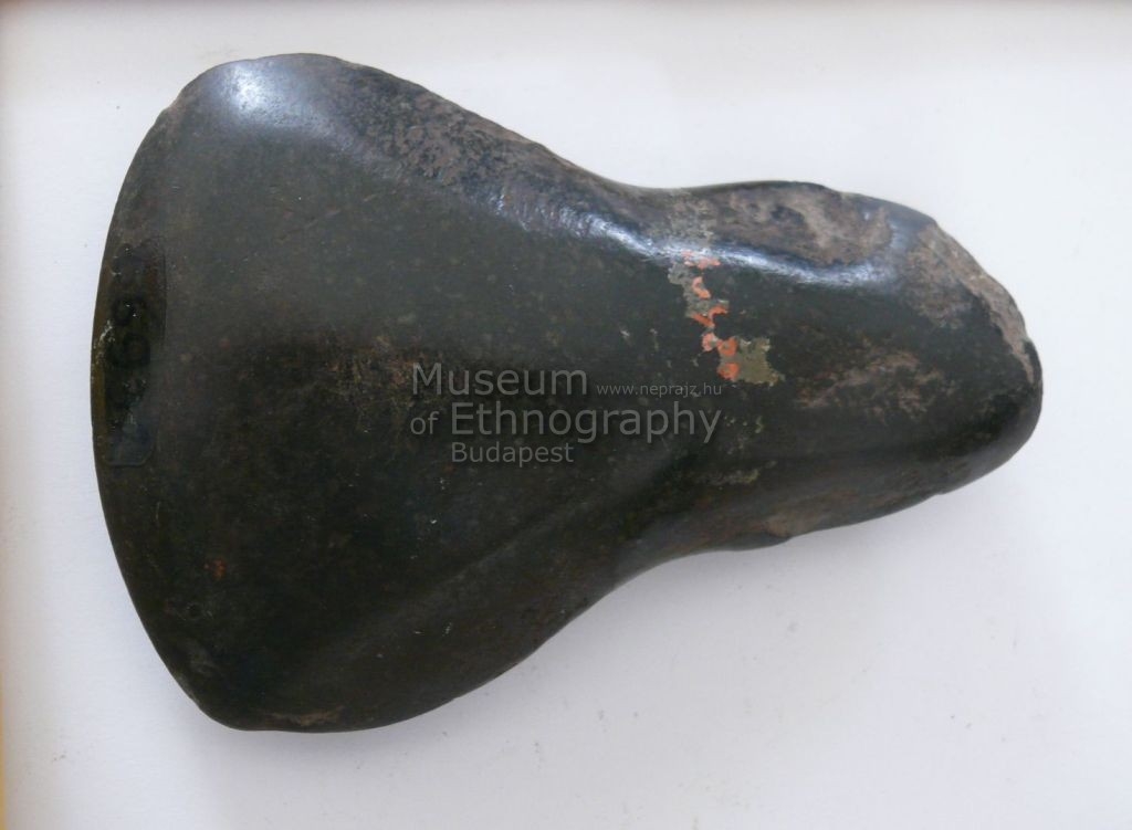 Sötétzöldes színű kőből finoman csiszolt, kétoldalt legömbölyített, alul élben végződő „vállas penge”