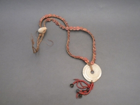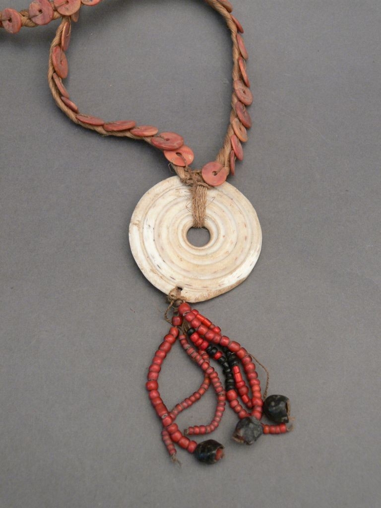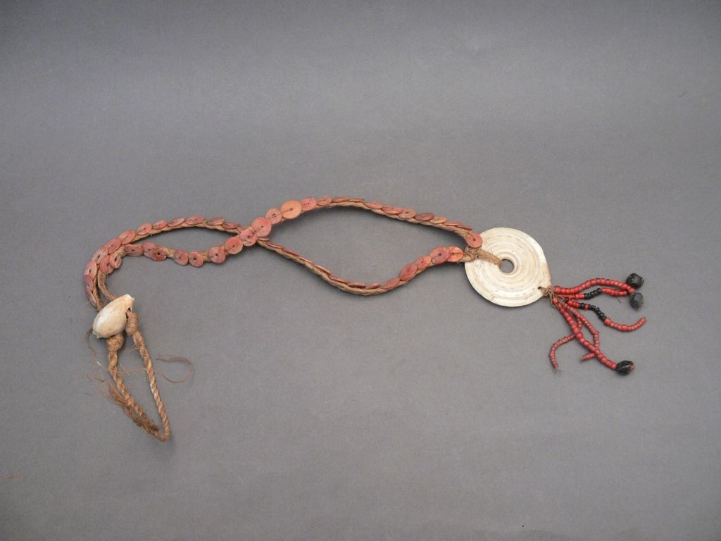 Laza rostfonatra felfűzött vöröses színű, középen átfúrt kagylókorongokból (kaloumwa) álló füzér, alsó végén kerek, fehéres színű nagy conus kagylólappal és erről lelógó vörös-fekete színű gyöngyökkel, felül fehér (buna) csigával (tojás kauri). Kula