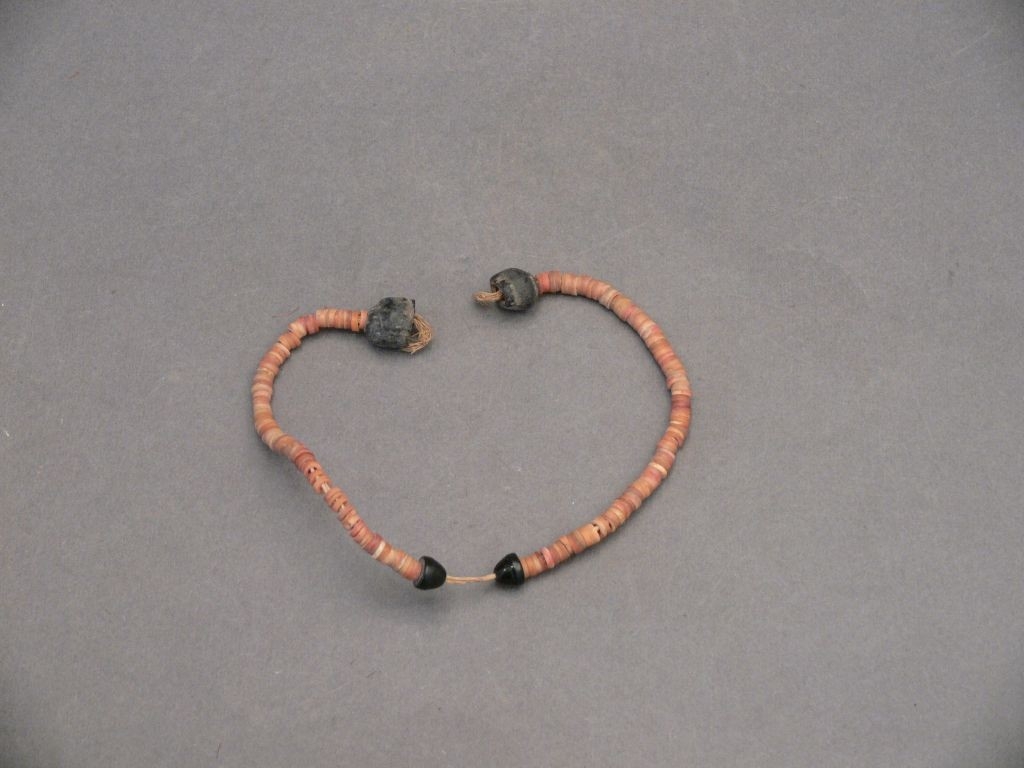 Növényi rostra fűzött vöröses színű kagylókorongokból (kaloumwa) áll, két végén fekete növényi magvakkal