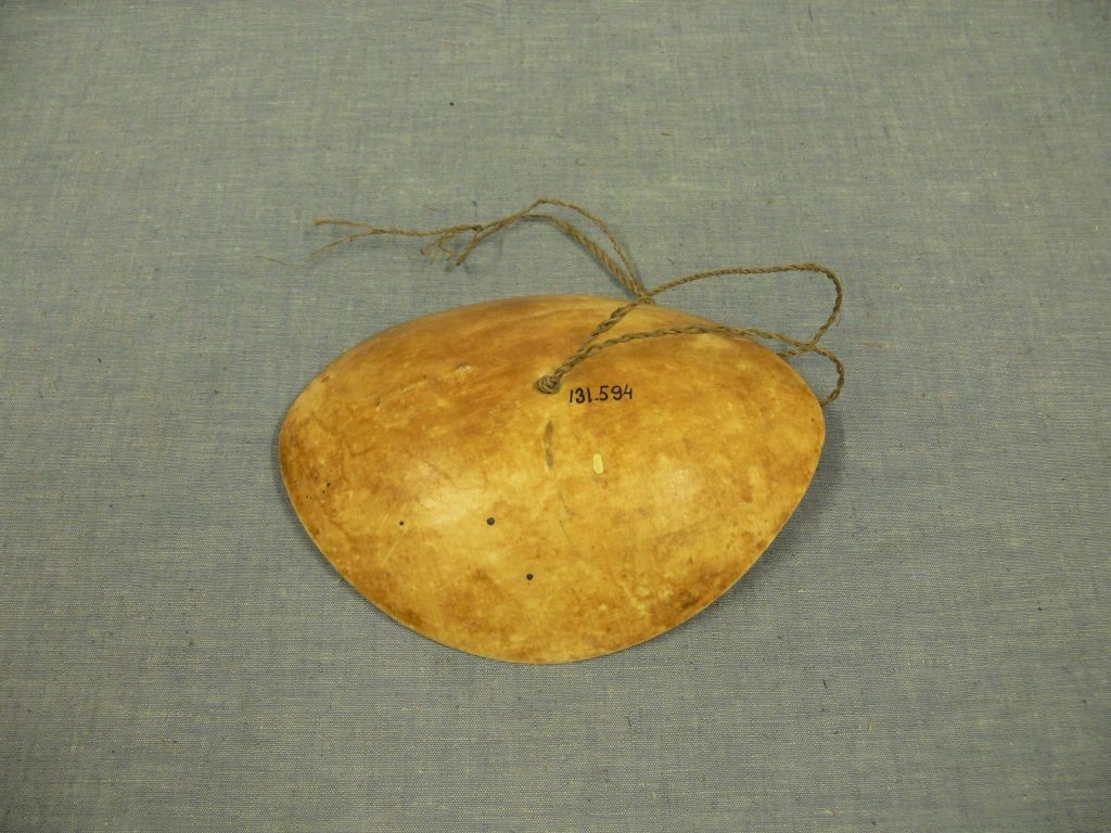 Homorú, szélein lecsiszolt, csúcsos ovális alakú, belül fehéres sárga, kívül sárgás-barna színű kagylóból készített ékszer. A homorú rész közepén lyuk látszik, amelyen a nyakba erősítés céljait szolgáló zsinór húzódik keresztül.