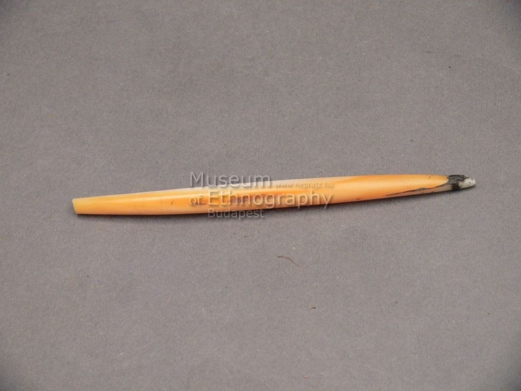 Kagylóból készült hengeres pálcika. Egyik végén fekete anyag, másik törött
