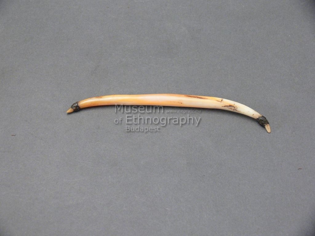 Kagylóból csiszolt, hosszúkás, hengeres, fehér-vöröses színű, kissé ívelt, mindkét végén hegyes tárgy.