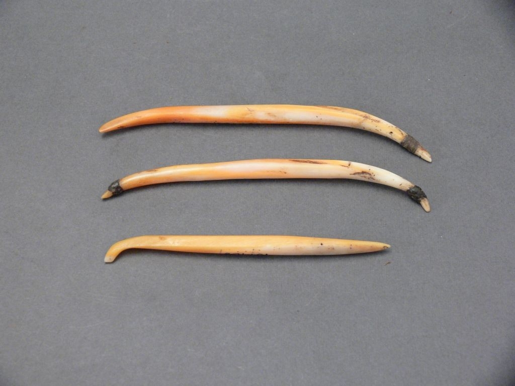 Kagylóból csiszolt, hosszúkás, hengeres, fehér-vöröses színű, kissé ívelt, mindkét végén hegyes tárgy.