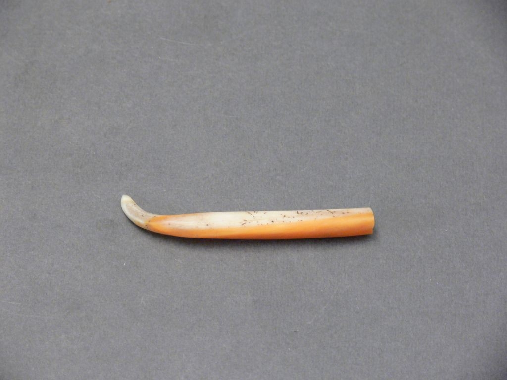 Kagylóból csiszolt, hosszúkás, hengeres, fehér-vöröses színű, egyik végén hegyes, másikon tompa tárgy. Kb. fél hossza hiányzik.