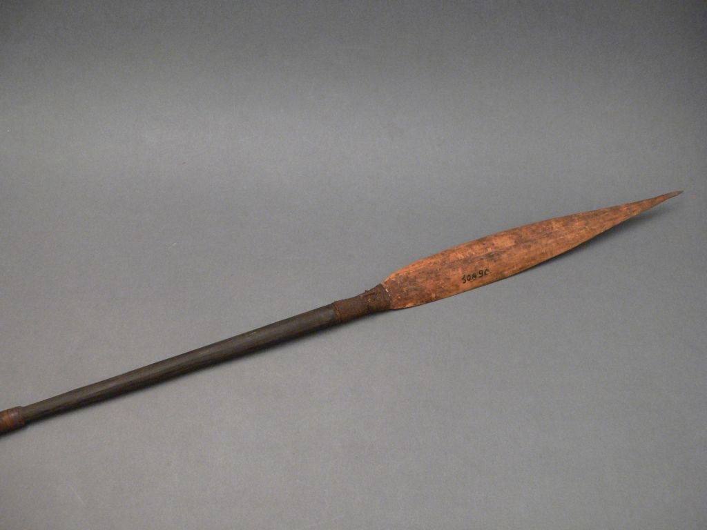 Háromrészes nyílvessző. A bambuszból metszett szárba növényi rostzsinórral rögzítették a keményfából faragott középrészt, ahhoz pedig ugyanilyen módon a levélalakú, bambuszból hasított hegyet.