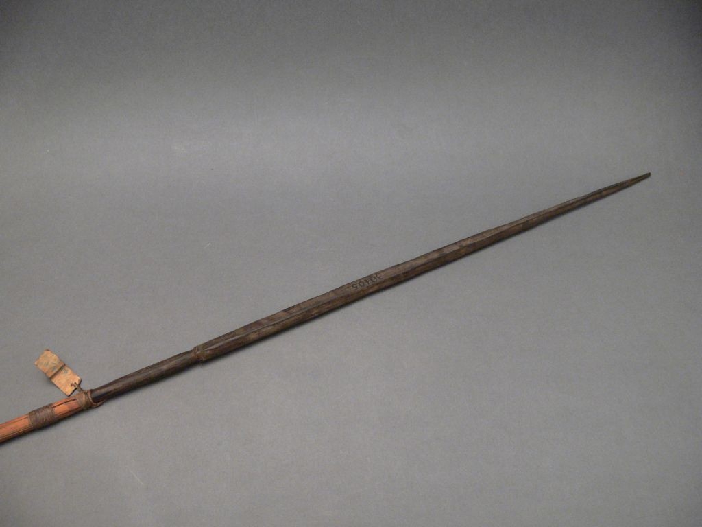 Kétrészes nyílvessző. A bambuszból metszett szárba növényi rostfonattal rögzítették a keményfából faragott, négyszögletes keresztmetszetű hegyet, melynek alsó harmadát kerekre faragták.