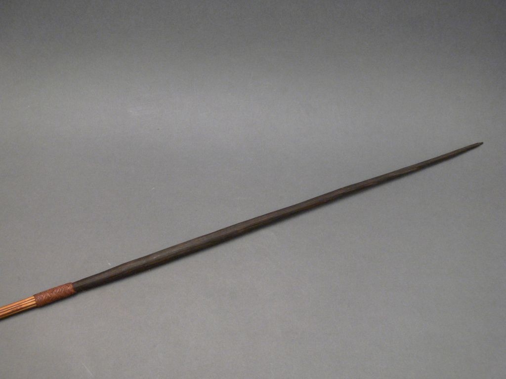 Kétrészes nyílvessző. A bambuszból hasított szárba növényi rostból készült fonattal rögzítették a keményfából faragott, kerek keresztmetszetű hegyet. A szárba öt helyen párhuzamos csíkokat égettek bele díszítésképpen.