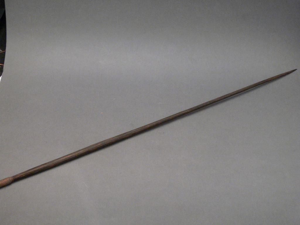 Kétrészes nyílvessző. A bambuszból metszett szárba növényi rostfonattal rögzítették a keményfából faragott, kerek keresztmetszetű hegyet.
