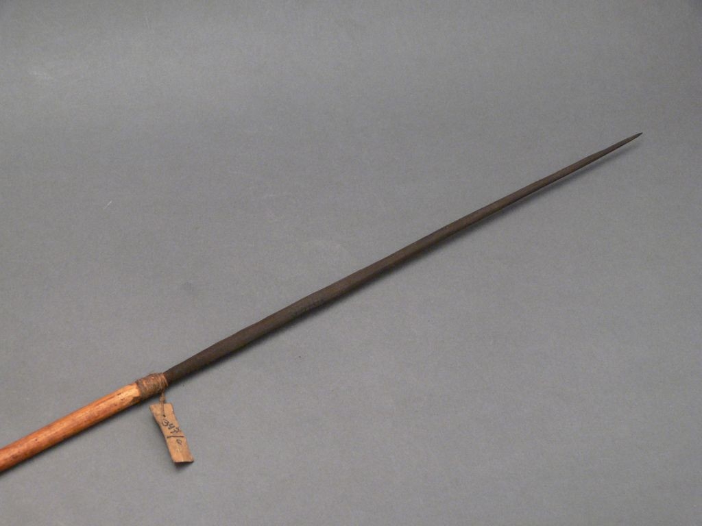 Kétrészes nyílvessző. A bambuszból hasított szárba növényi rostból készült fonattal rögzítették a keményfából faragott hegyet. A szárba párhuzamos vonalakból álló díszítést égettek.