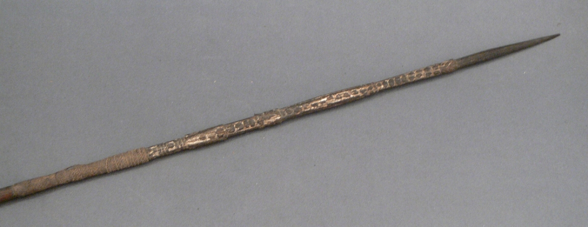 Kétrészes nyílvessző. A bambuszból metszett szárba növényi rostfonattal rögzítették a fából faragott hegyet, melybe geometrikus elemekből álló, fehér festéssel ellátott motívumokat faragtak.