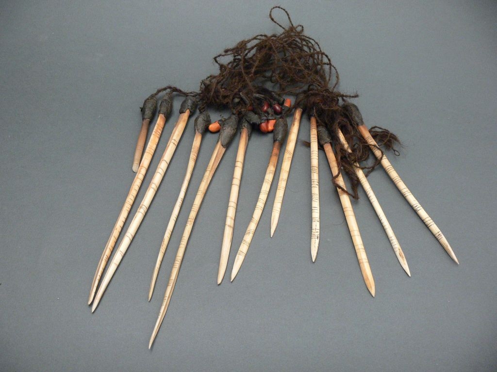 Szőrfonaton (haj?) tíz darab kihegyezett csont, a fonatra gyantával van sorba erősítve. A csontokat karcolt vonalak díszítik.