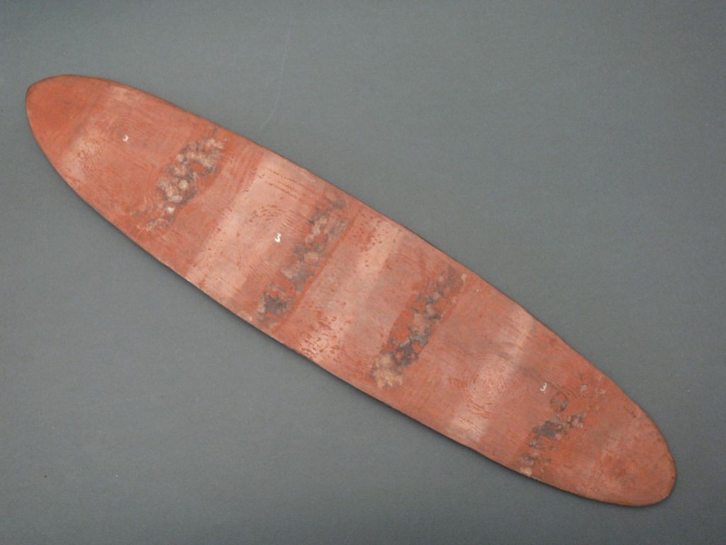 Keményfából faragott, ovális alakú, mindkét oldalán vésett geometrikus díszítés. Egyik oldalán fehér festéknyomok.