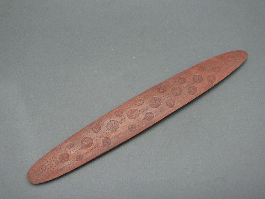 Keményfából faragott, lapos nyújtott ovális alakú, mindkét oldalán vésett, geometrikus díszítés. Vöröses színűre festett.