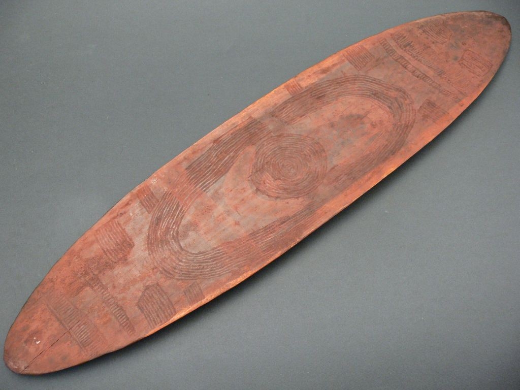Keményfából faragott, lapos, hosszúkás ovális alakú tárgy, mindkét oldalán vésett, geometrikus díszítés. Vörösesre festett.