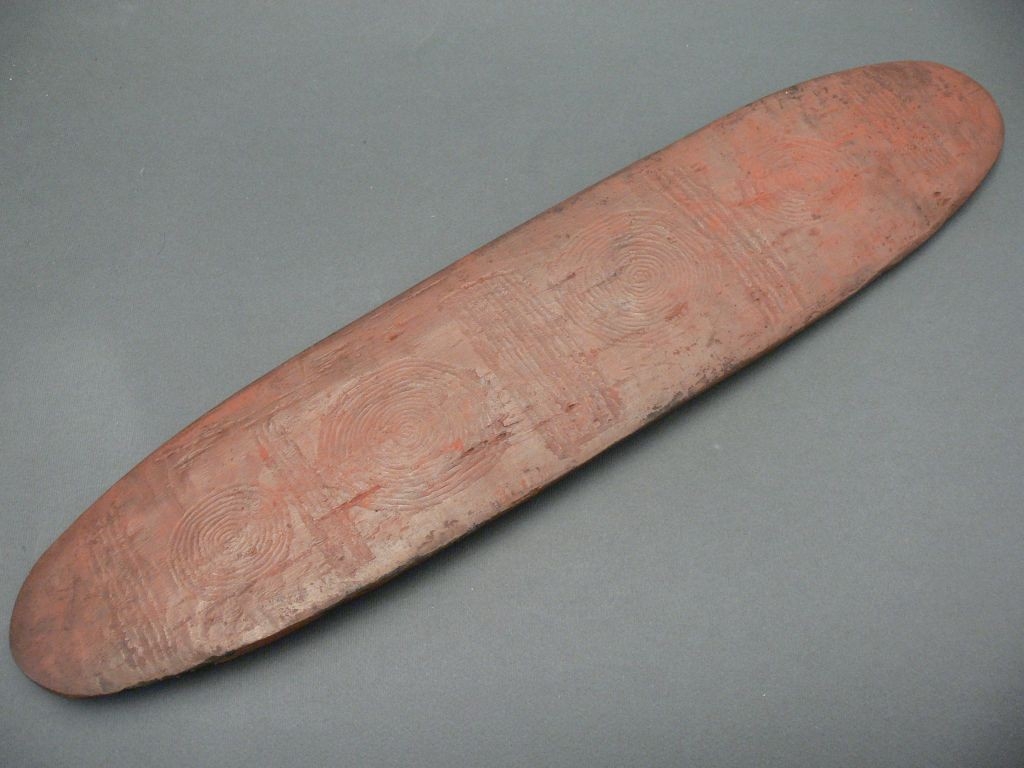 Keményfából faragott, lapos, ovális alakú tárgy, mindkét oldalán vésett geometrikus díszítés. Vörösesre festve.