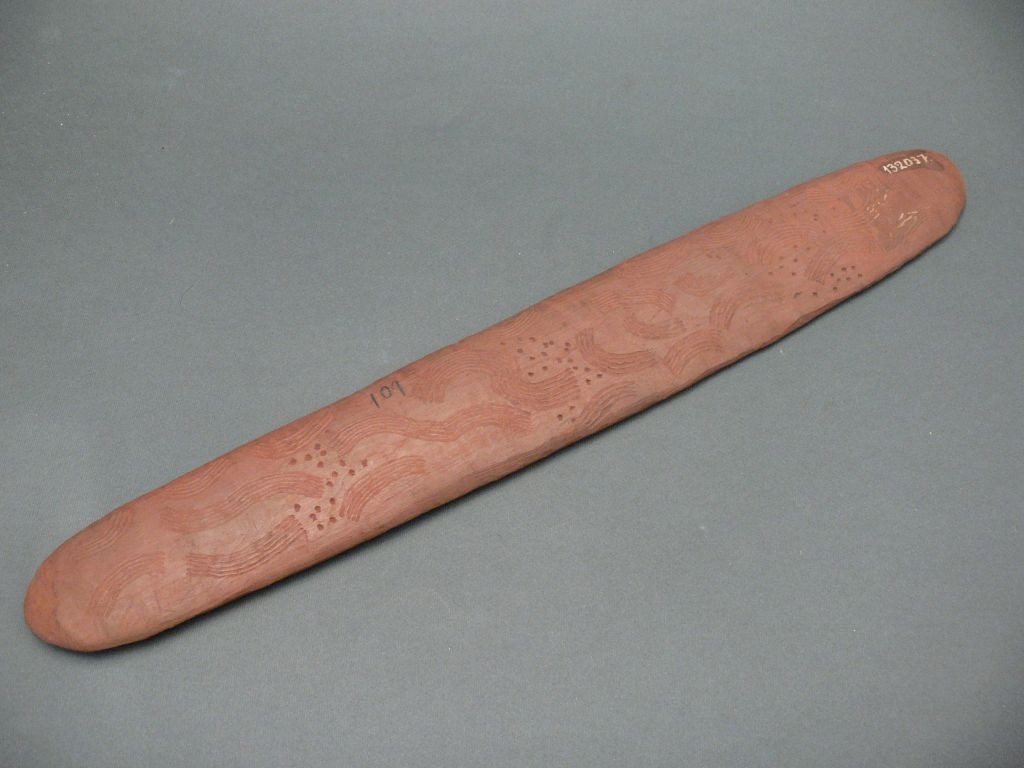 Keményfából faragott, lapos, ovális tárgy. Mindkét oldalán vésett, geometrikus díszítés. Vöröses színűre festett.