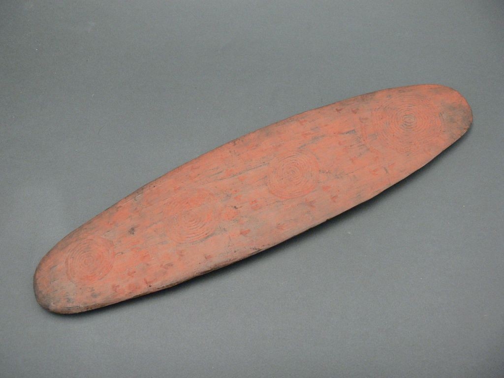 Keményfából faragott, ovális alakú, mindkét oldalán vésett, geometrikus díszítés, vörösesre festett.