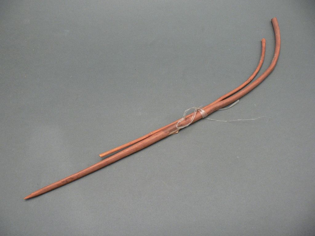 Két darab hajlított végű, színezett, hántolt vessző. A nagyobb bot vége hegyezett.