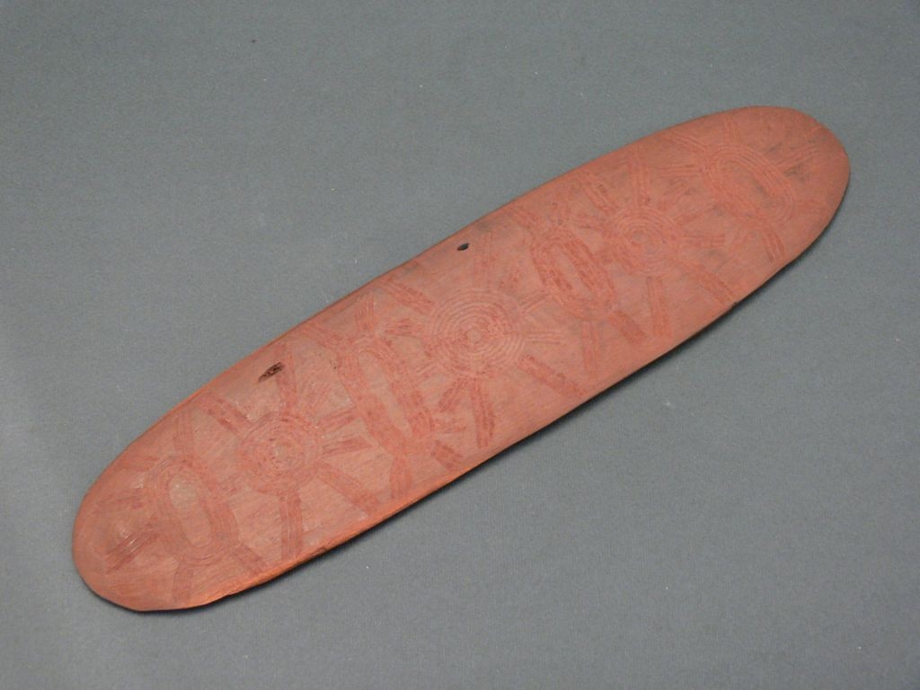 Keményfából faragott, ovális alakú, mindkét oldalán geometrikus díszítés. Vöröses színűre festett.