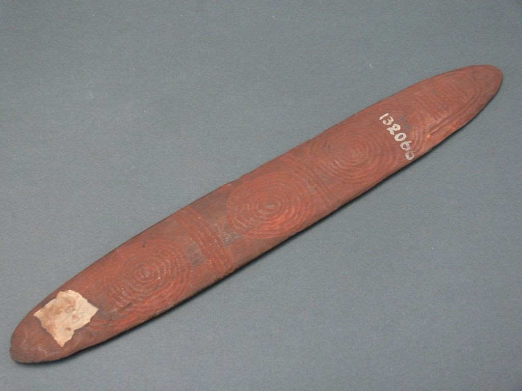 Keményfából faragott, ovális alakú, mindkét oldalán geometrikus díszítéssel. Vörösesre festett.