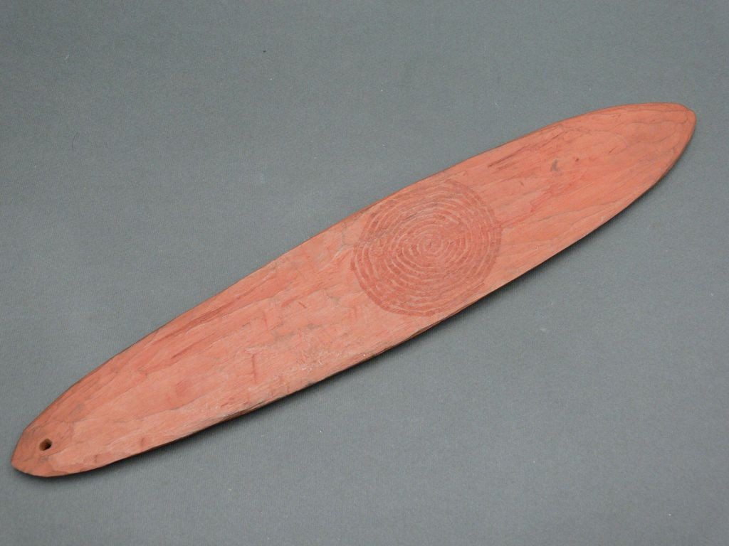 Keményfából faragott, ovális, mindkét oldalán vésett geometrikus díszítés, egyik végén lyukkal. Vörösesre festett.