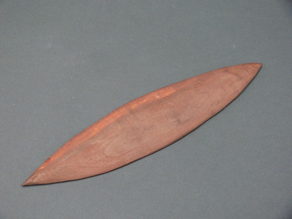 Keményfából faragott, lapos, mindkét vége hegyes, vöröses színűre festett tárgy.