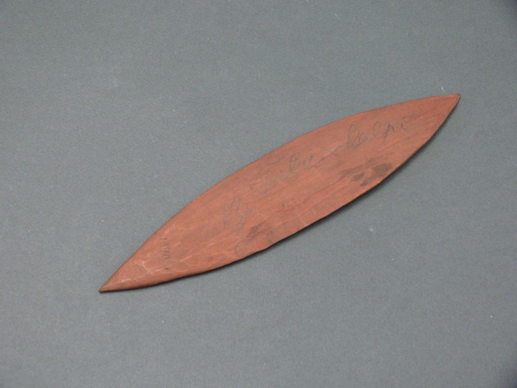 Keményfából faragott, lapos, mindkét végén hegyes, vörösesre festett tárgy.
