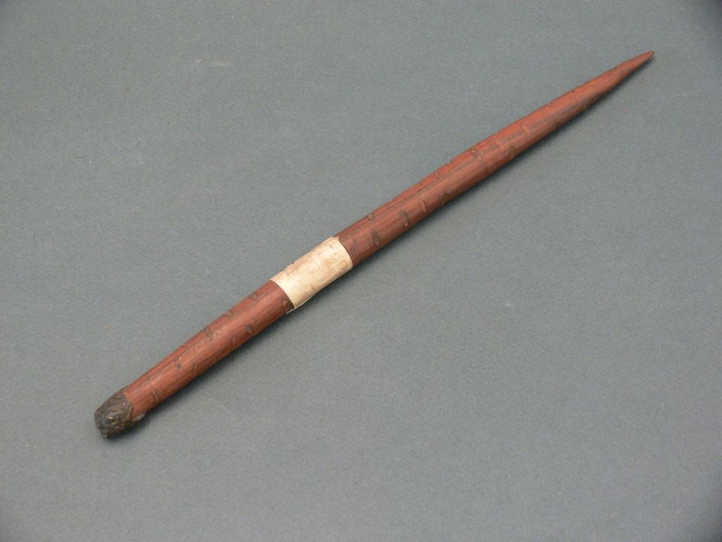 Kihegyezett végű fa, másik végén gyanta, madzagmaradvánnyal. Teljes felületén rövid vésett csíkokkal