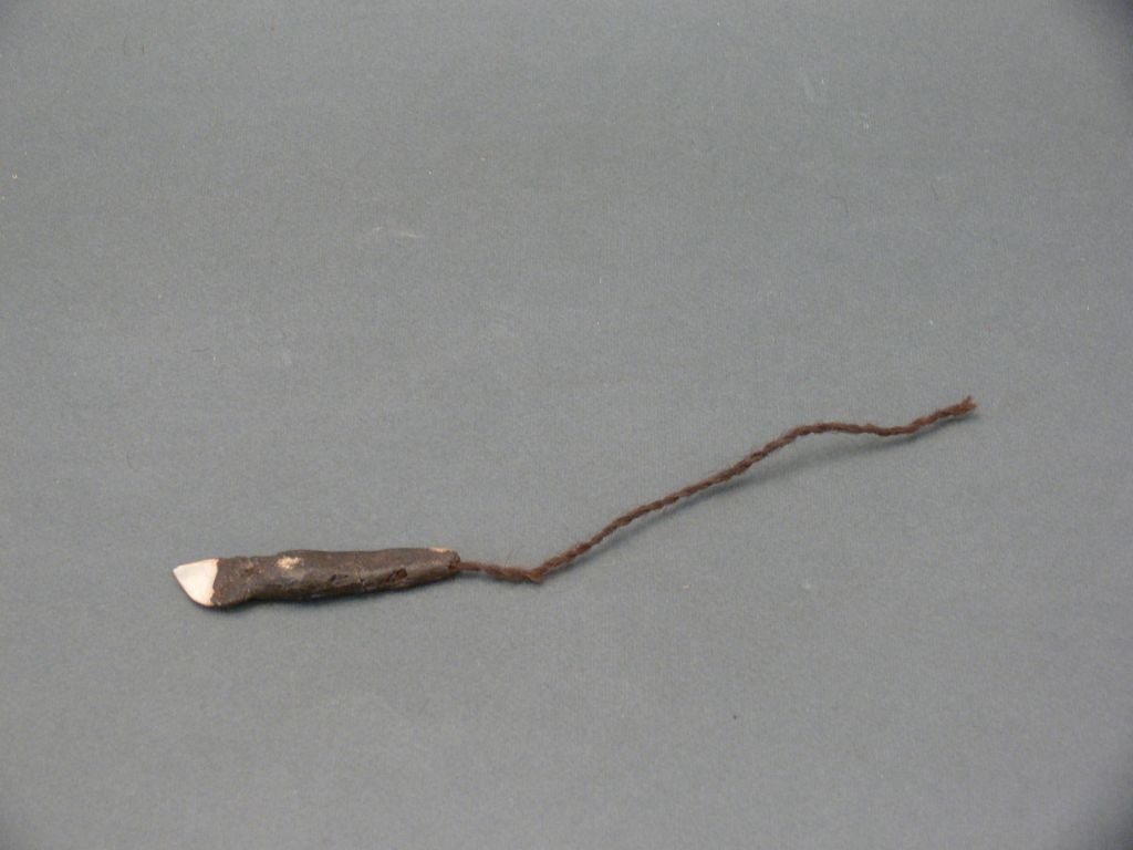 Gyantába ágyazott, hegyes végű kagylódarab, a gyanta másik végében hajfonat van.
