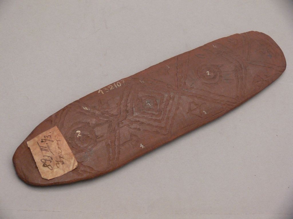 Keményfából faragott, ovális alakú, mindkét oldalán geometrikus díszítéssel. Vörösesre festett.