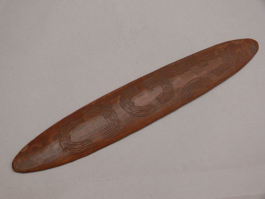 Keményfából faragott, ovális alakú, mindkét oldalán vésett geometrikus díszítéssel. Vöröses színűre festett.