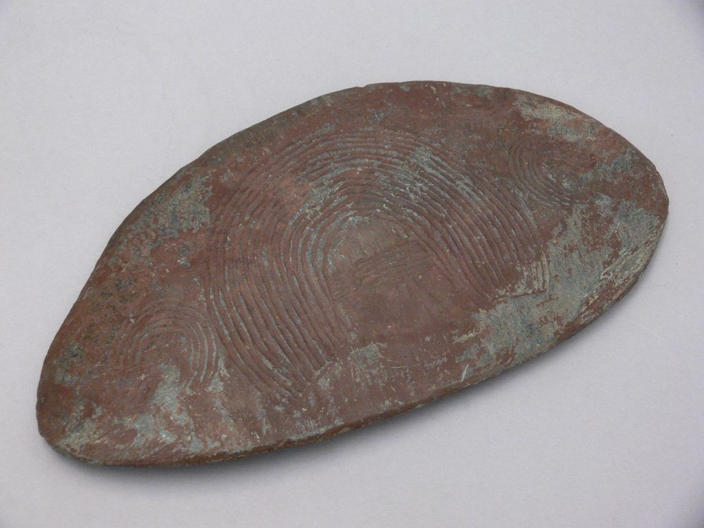 Andezit kőből készült, ovális alakú, mindkét oldalán karcolt geometrikus díszítés van. Barnára festett.