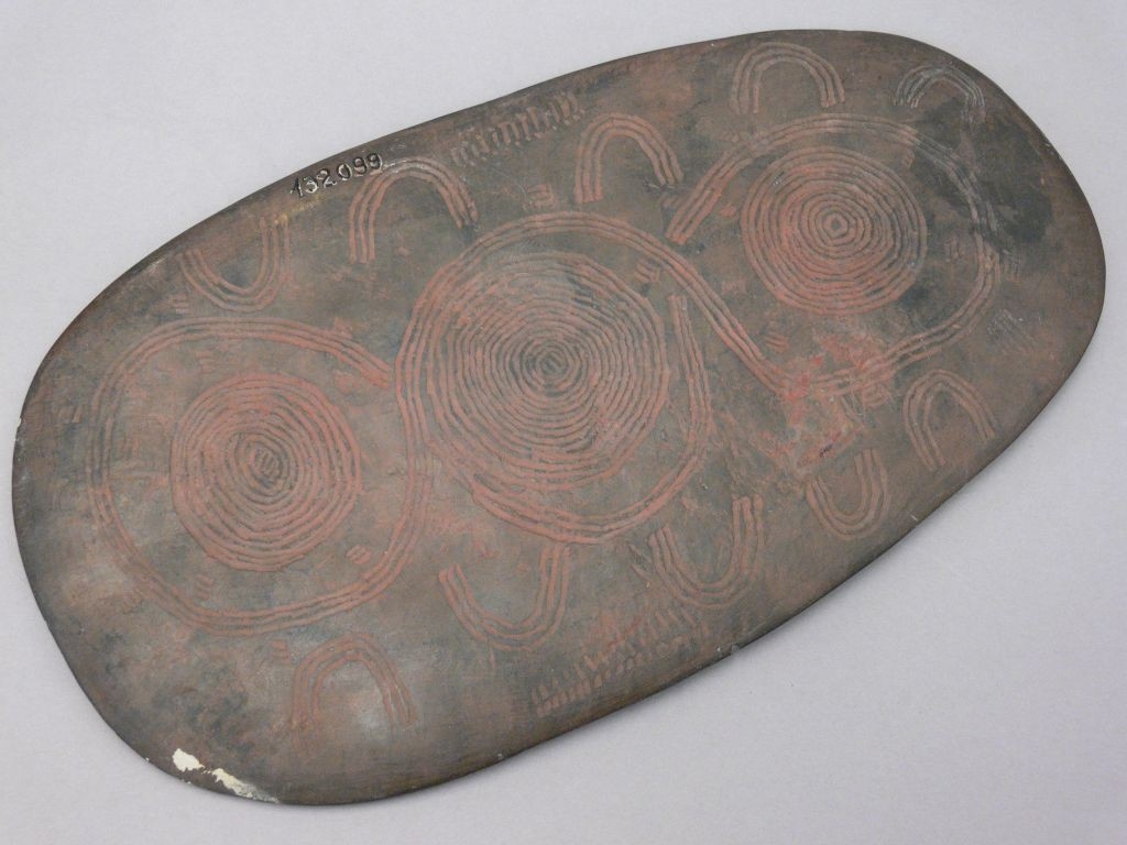 Palából készült, ovális alakú, mindkét oldalán karcolt, geometrikus díszítéssel. Vörös színű festékkel befestett.