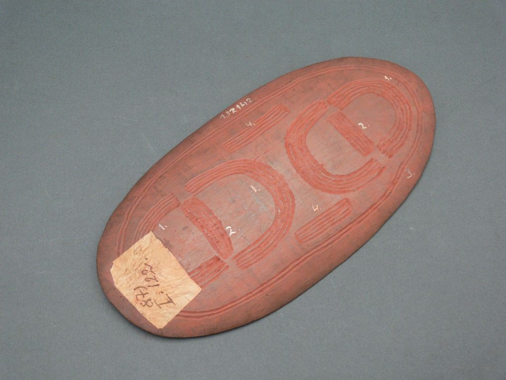 Vörösre festett, keményfából faragott ovális tárgy. Egyik fele lapos, a másik domború. Mindkét oldalán nagy kettős ellipszis vonalban két-két ötsávos egyenes véset, köztük középen két-két megszakadó harántvésettel elválasztott kisebb ovális látható.