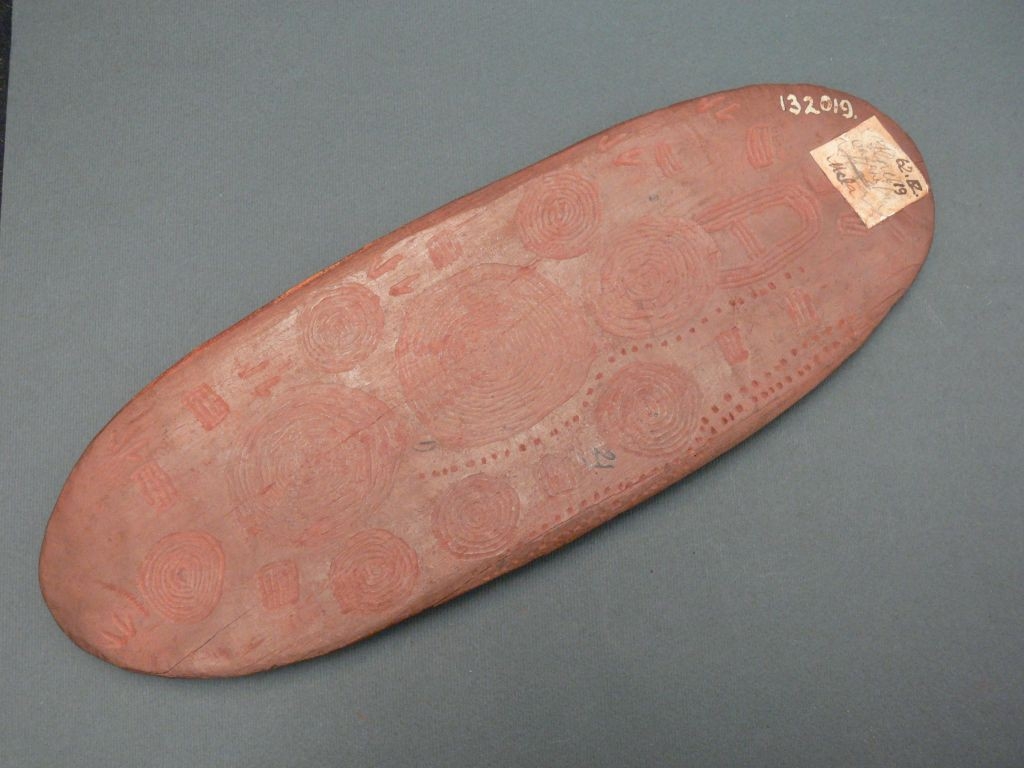 Keményfából faragott, lapos, hosszúkás ovális alakú, mindkét oldalán vésett, geometrikus díszítéssel. Vörösesre festett.