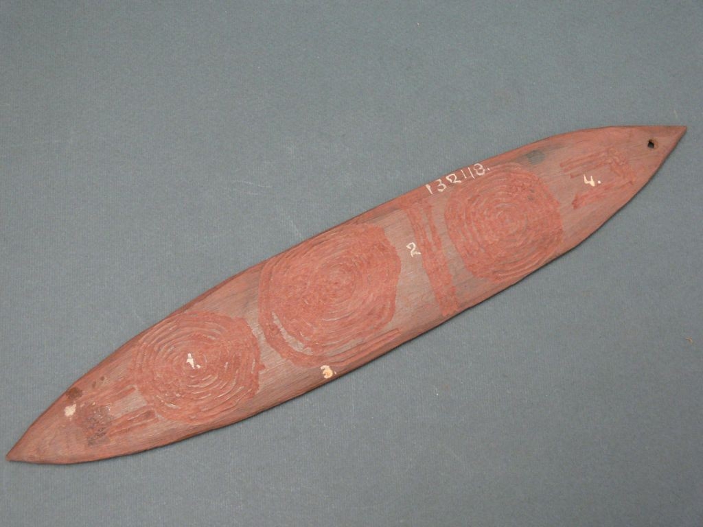Keményfából faragott, mindkét vége kihegyezett, mindkét oldalán vésett geometrikus díszítéssel, egyik végén lyukkal. Vöröses színre festett.