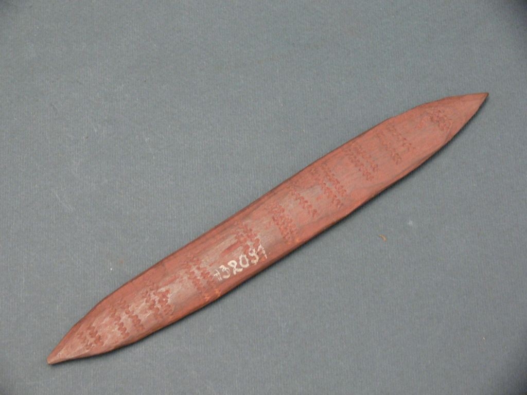 Keményfából faragott, ovális, mindkét vége kihegyezett, mindkét oldalán vésett geometrikus díszítés. Vörösesre festett.
