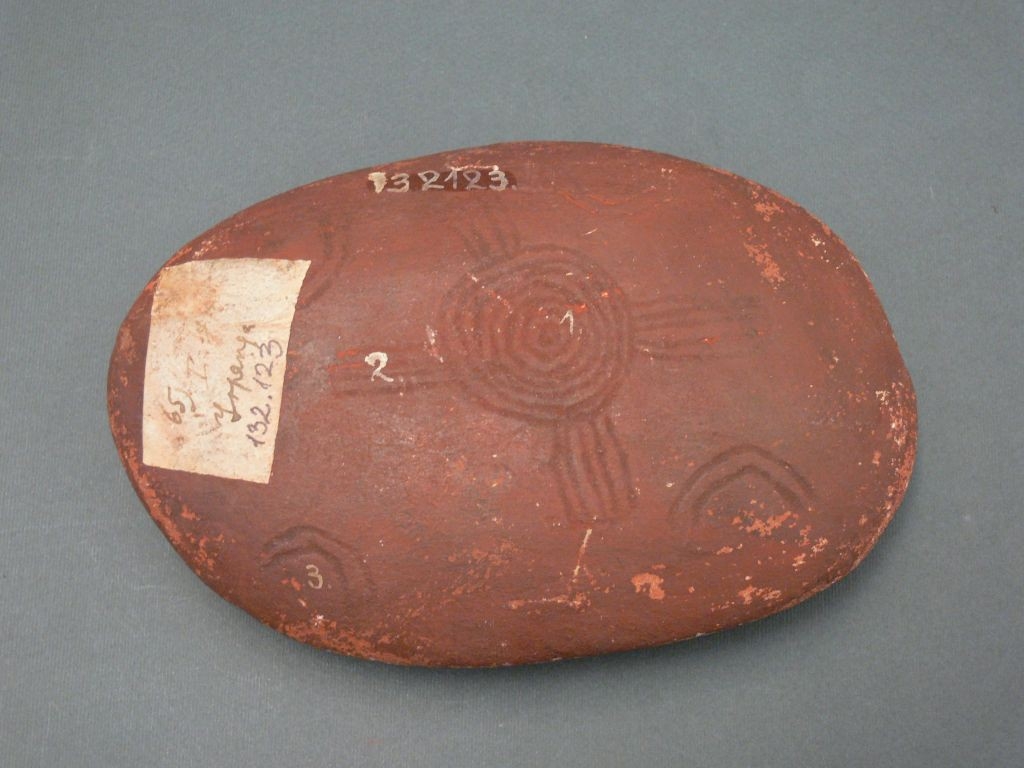 Lapos, ovális alakú kavics, mindkét oldalán karcolt, geometrikus díszítéssel. Vörösesre festett.