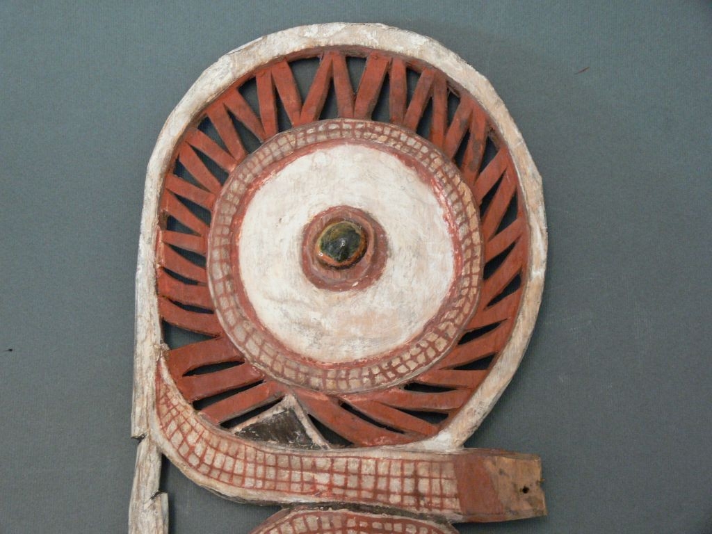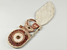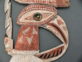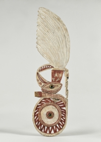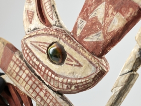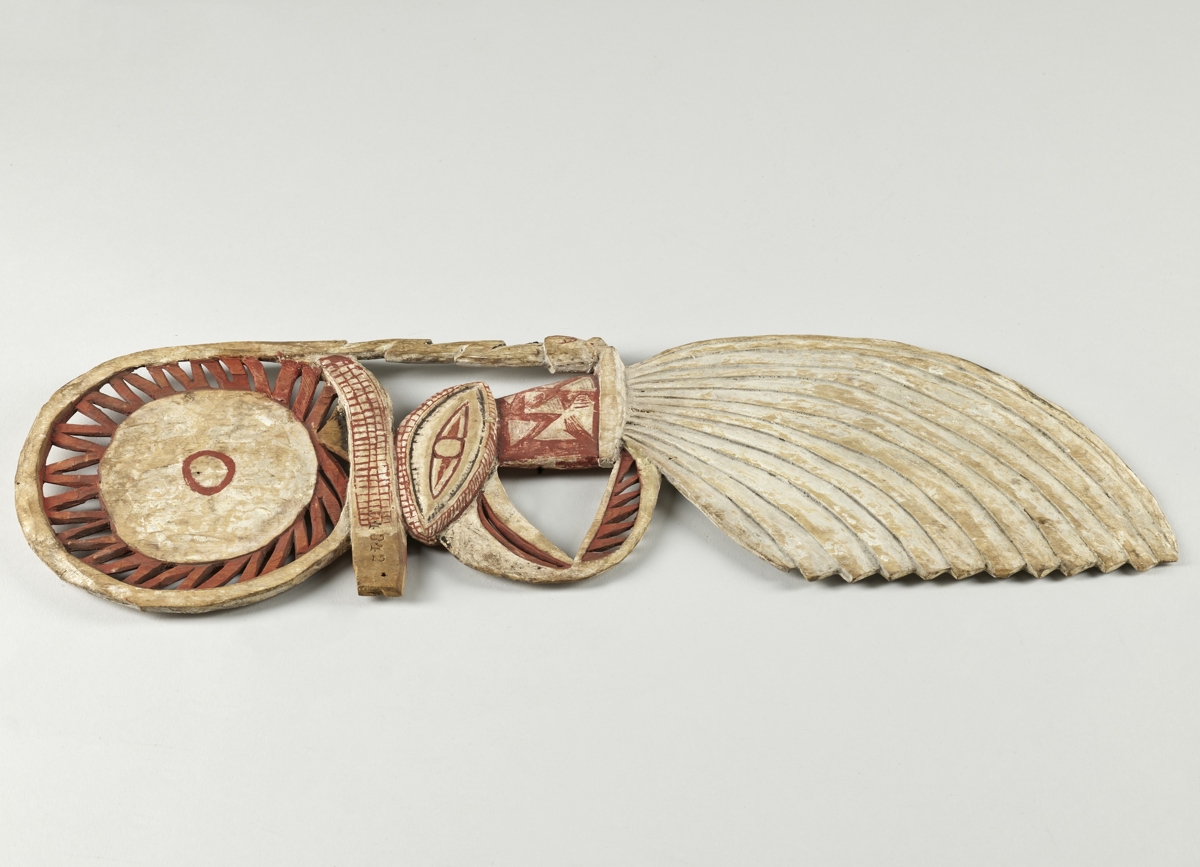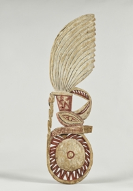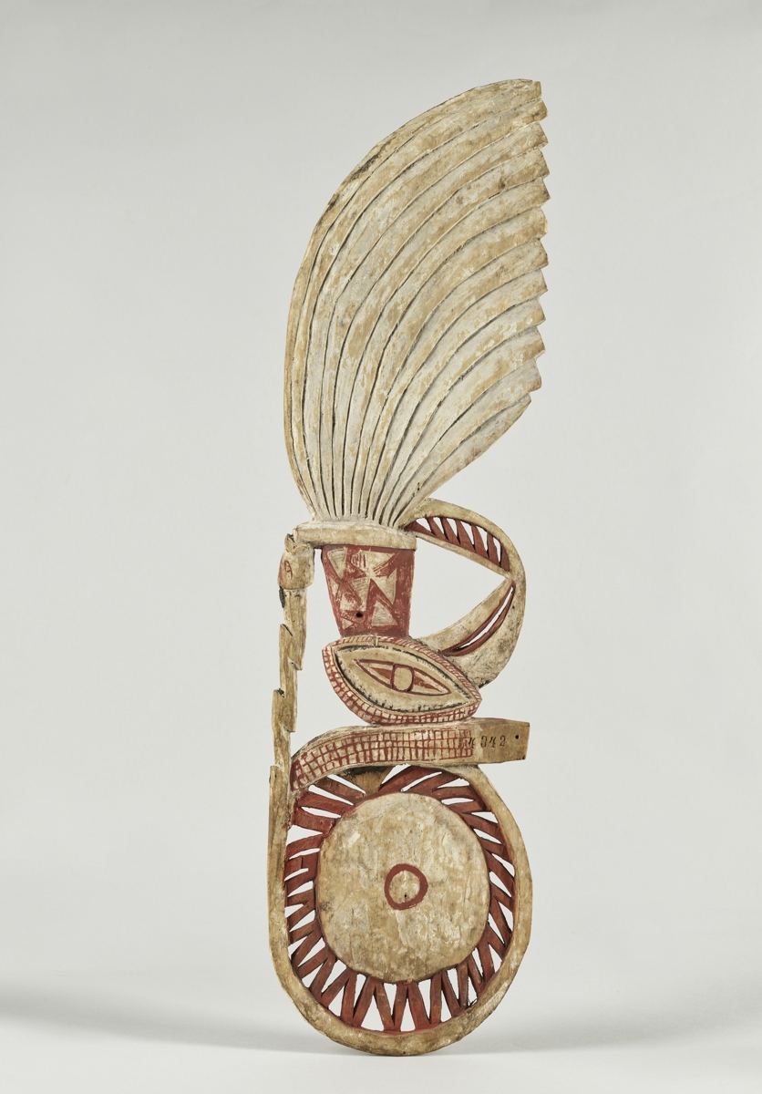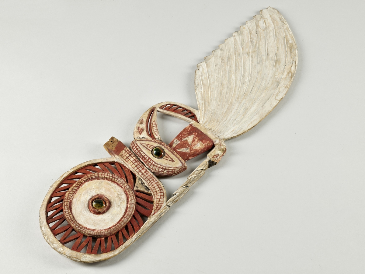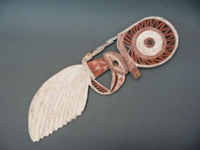 Könnyű fából készült lapos hosszúkás, áttört faragvány, malangan maszk fül. Felső része kör alakú, középen kagyló berakással. Alatta madárfej és nyak, majd stilizált tollak következnek. A festés fehér, piros és fekete színű.