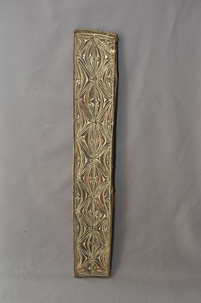 Fából faragott, téglalap alakú, lapos tárgy. Hátsó felülete sima, díszítetlen, középen fogóval. Elülső felülete mélyített, egy hosszanti irányban végighúzódó vonaltól kétoldalt szimmetrikusan elhelyezkedő motívumsorral díszített. Ennek mélyített vonalai fehérrel vannak inkrusztálva, a kiemelkedő részek vörös és fekete színűek. A tárgy hosszanti peremén kis lyukak vannak, ezen keresztül történt a peremet díszítő rotangcsíkok felerősítése.