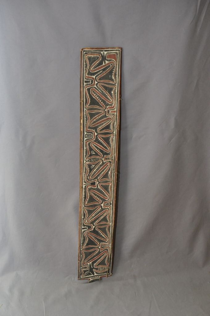 Fából faragott, téglalap alakú, lapos tárgy. Hátsó felülete sima, díszítetlen, középen fogóval. Elülső felülete mélyített, stilizált, vsz. állatmotívumokkal van díszítve. A mélyített vonalak fehérrel vannak inkrusztálva, a kiemelkedő részek vörös és feketés színűek. A pajzs hosszanti, két oldalán kis lyukak vannak, ezekkel történt a peremen lévő vékony rotangcsíkok felerősítése.
