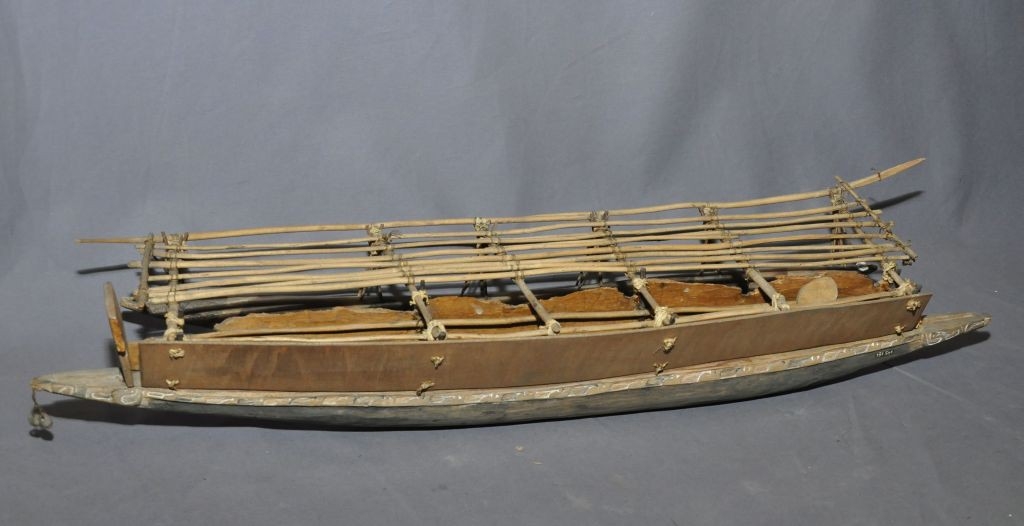 A csónaktest fából faragott, tömör. Egyik oldalán a csónaktestet magasító perem meglehetősen rossz állapotban megvan, másik oldalon hiányzik. A csónaktestbe négy helyen beerősített két-két pálcika által tartott hat keresztirányú rúd segítségével rácsrendszer van kialakítva, ehhez kapcsolódik a vendéghajó. A csónaktest orr- és tatrészén és egyik oldalán a perem mellett végig elmosódó ornamentikával van díszítve. Tatrészénél durván faragott csónakdísz.