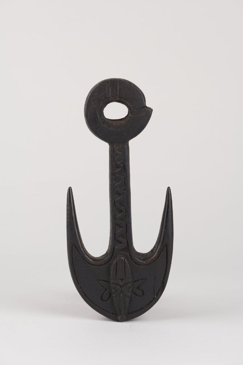 Egyetlen fadarabból faragott, kétágú horgony alakú, sötétbarnára színezett tárgy. Felfüggesztésére szolgáló, gyűrű alakú felső részét jabo motívumot formáz. Ennek felső részén jól láthatók a függesztőzsinór okozta bemélyülő kopásnyomok. A fogas hosszanti szárának mindkét oldalán hullámzó, domborúan faragott kígyóvonal fut végig. A tárgyak felakasztására szolgáló alsó rész közepén mindkét oldalt egy-egy a tárgy síkjából kiemelkedő, erősen megnyújtott, állati jegyeket mutató, fejfedővel ellátott arc látható, melyek füleit bekarcolták a tárgy felületébe. Bíró ezt balum-káuj arcnak nevezi.