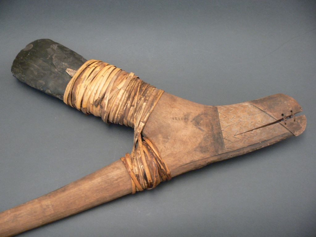 Fából faragott, világos színű tárgy hengeres nyéllel. A zöldes színű, durván csiszolt 'Walzenbeil' típusú penge a behasított fejrészbe kéregtok és háncscsík segítségével van erősítve. Kiálló fejrészét mindkét oldalon farkasfog vésés díszíti. Efölött a fejrész be van hasadva, ezt varrás szerűen rosttal rögzítették.