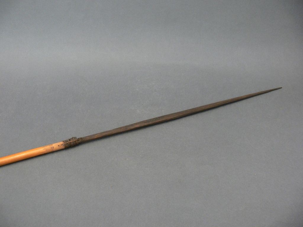 Kétrészes nyílvessző. A bambuszból metszett szárba növényi rosttal rögzítették a keményfából faragott, kerek keresztmetszetű hegyet.